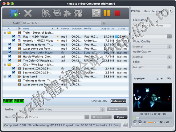 通過設置分割文件大小,時間長短,可以平均分割大文件轉換成零件在4Media視頻轉換